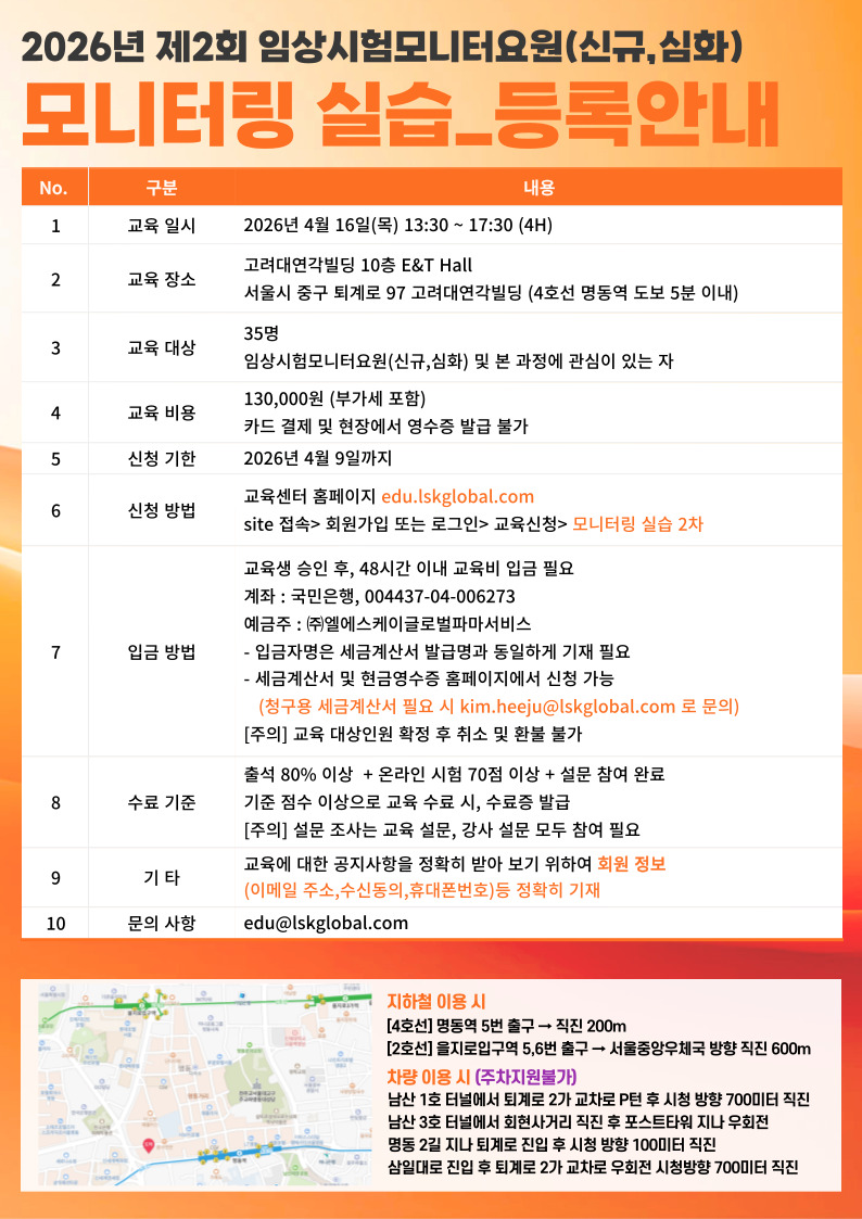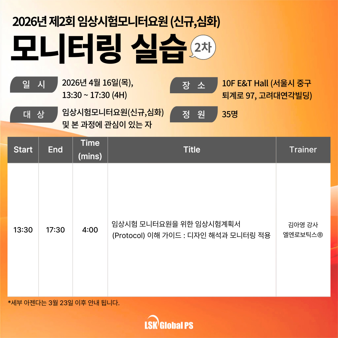 * 본 과정은 임상시험모니터요원 신규,심화 교육으로 인정됩니다.