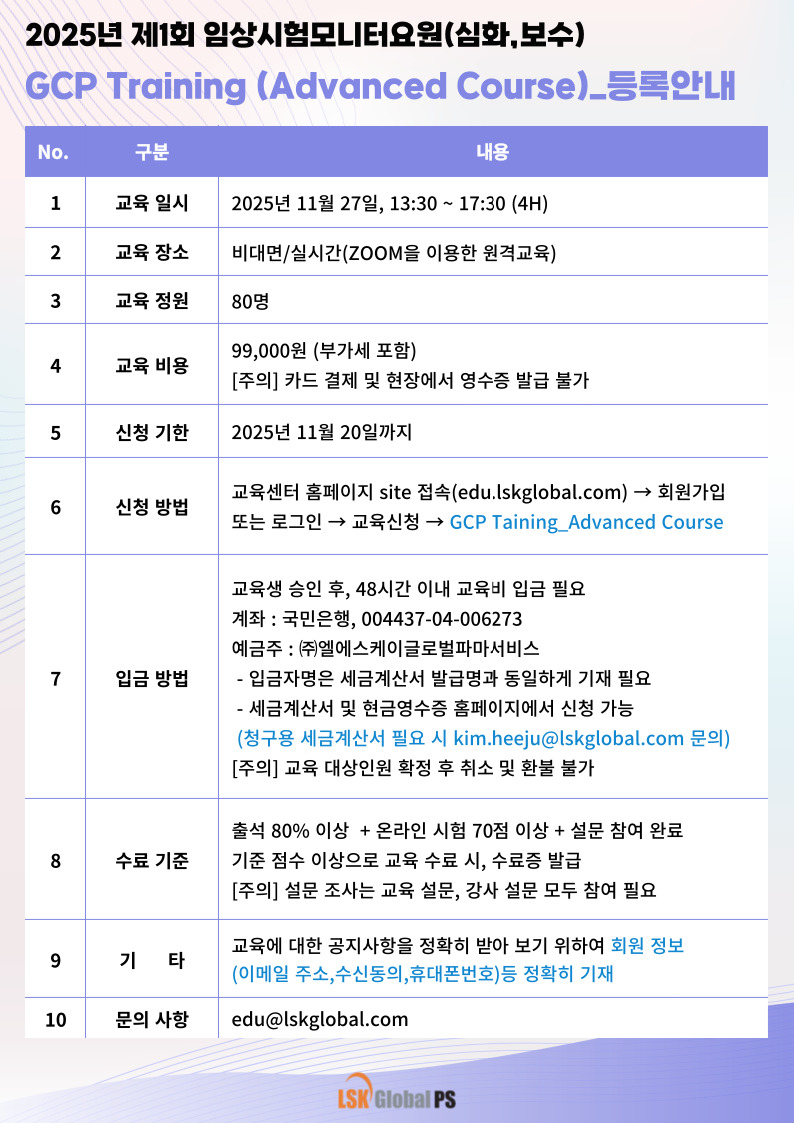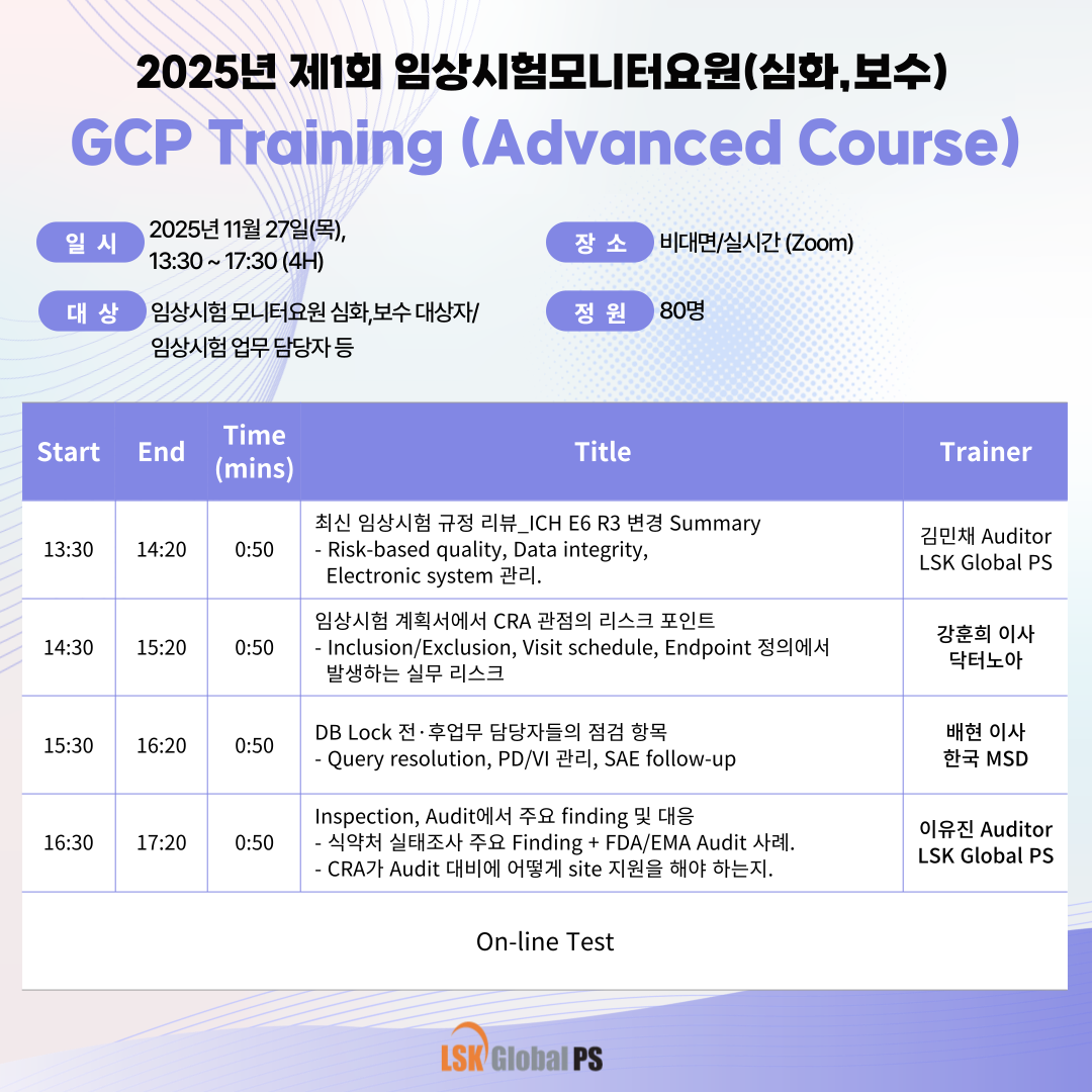 | 카테고리 | 임상시험모니터요원 > GCP > Advanced GCP(심화/보수) | ||